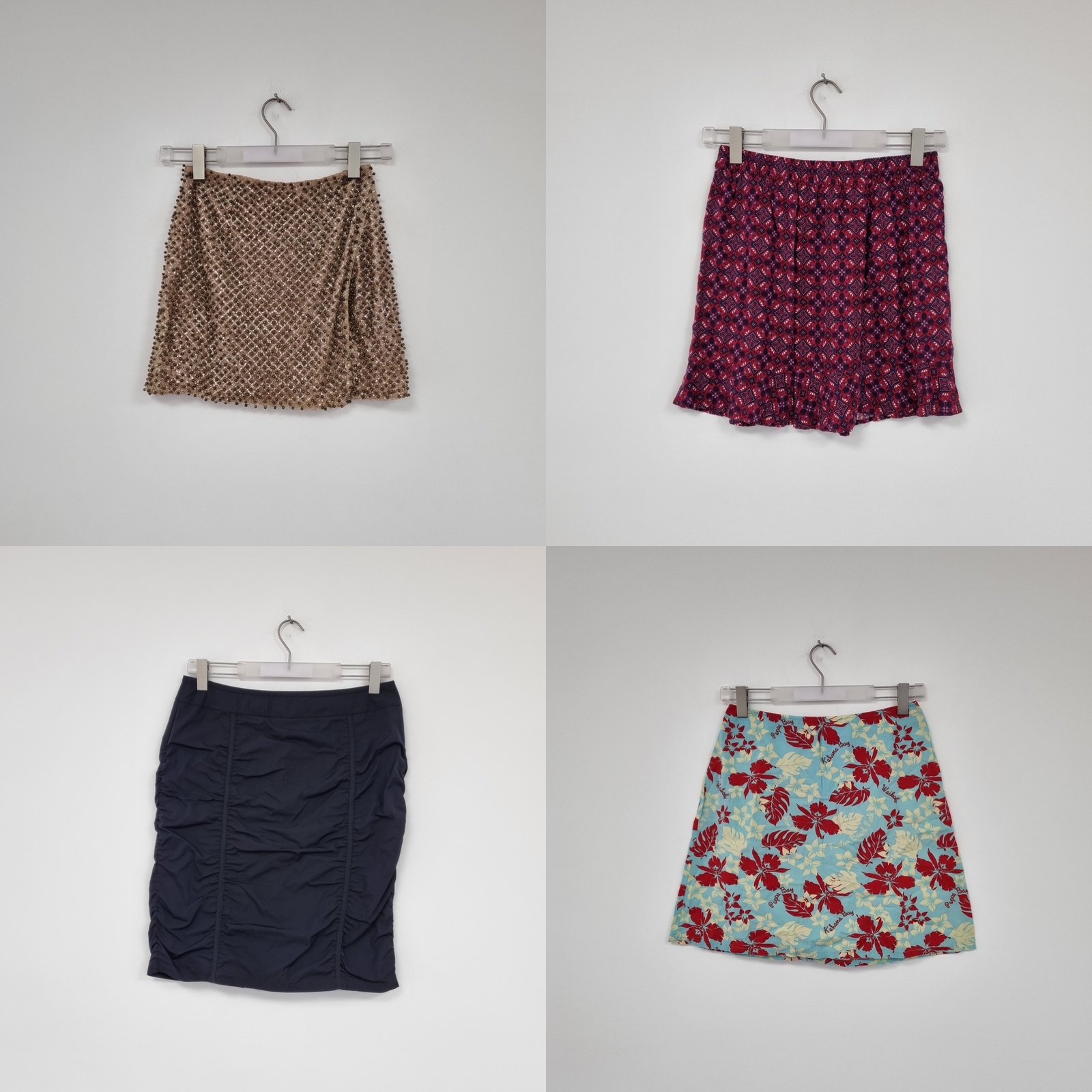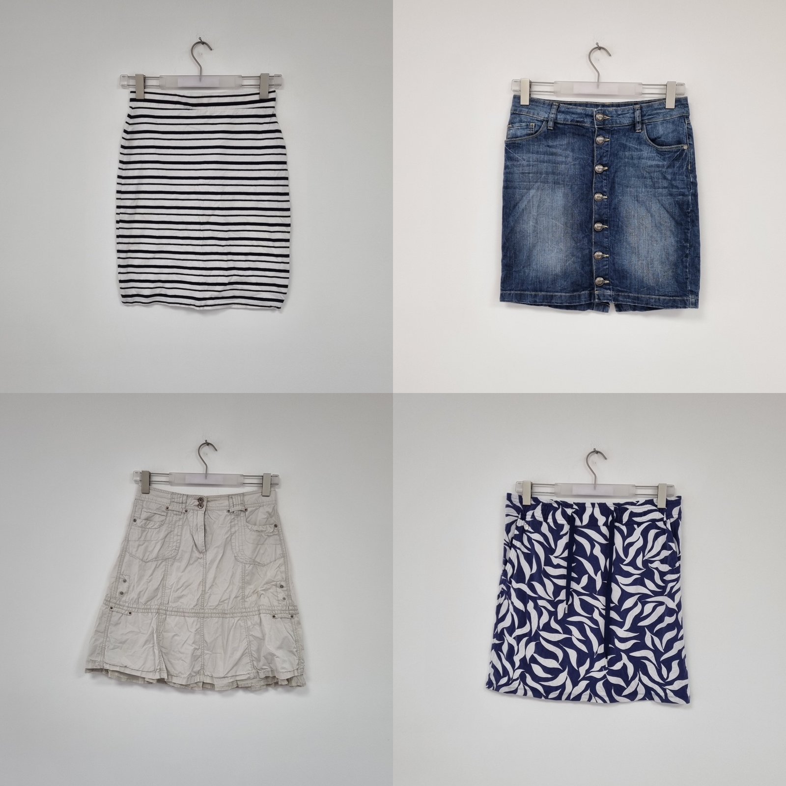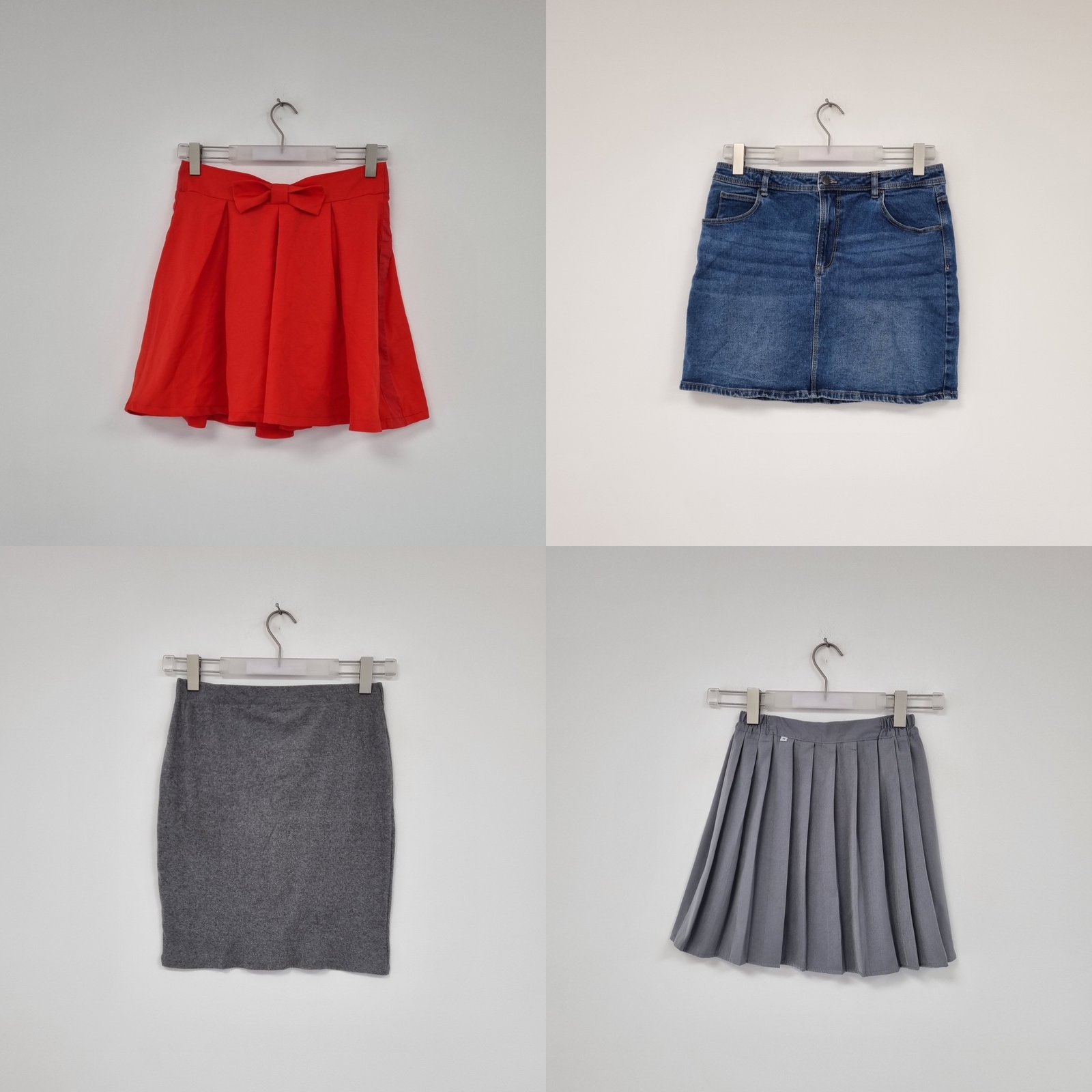 W skład pakietu wchodzą: spódnice damskie w różnych rozmiarach,